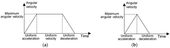 Second, when the adjustment value of the angular is small, this angular adjustment process is a “uniform acceleration-uniform deceleration” process, as shown in Figure A1a; and it is a “uniform acceleration-uniform velocity-uniform deceleration” process when the adjustment value of the angular exceeds a certain value, as shown in Figure A1b. The boundary value of the angular is denoted by , and it can be formulated as follows: