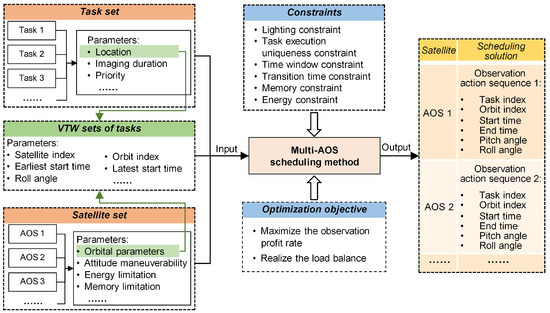 As shown in Figure 3, the inputs of the MAOSSP include a task set, a satellite set, and VTW sets of tasks, and the output scheduling solution consists of multiple observation action sequences. Before the formal solution, the VTW sets of all tasks are obtained according to the task location and the orbital parameters of satellites in the simulation system. In the solving process, the Multi-AOS scheduling method must fully consider a series of constraints, and its optimization objective is to maximize the observation profit rate and realize the load balance simultaneously.