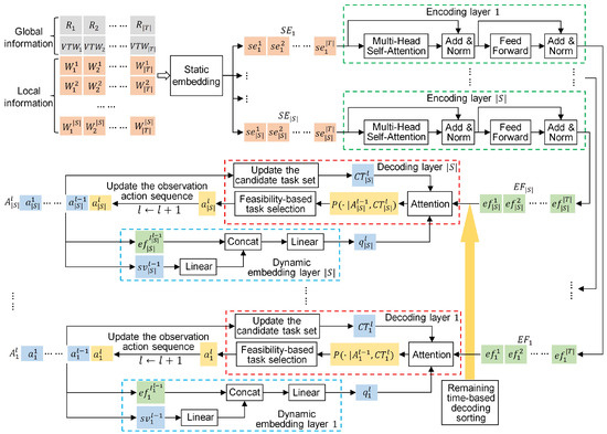- Static feature extraction stage. In this stage, encoding layers with a static embedding layer are used to extract distinctive features from the input task information and provide them to the corresponding decoding layers. The input task information contains the requirements and VTW sets of the tasks. Considering that the VTWs of a task originate from different satellites, we classify the task information into global information and local information. For the task i, its global information contains its requirement information and the overall set of all its VTWs , and the VTW set that originates from the satellite j is the local information. A local feature-enhancement strategy is proposed to handle the input task information, which is described as follows: