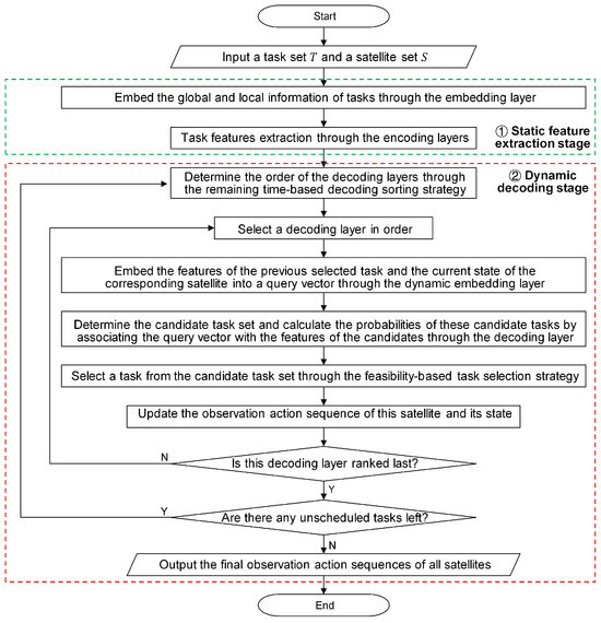 The most critical part of the MPN is that it adopts multiple attention layers as the multiple pointers, each of which is used to generate an observation action sequence for a different satellite. These attention layers belong to different decoding layers, and the number of decoding layers is equal to that of the satellites. In addition to the decoding layers, the important components of the MPN include a static embedding layer, multiple encoding layers, and multiple dynamic embedding layers. As shown in Figure 5, the workflow of this network model can be divided into two stages: a static feature extraction stage and a dynamic decoding stage, which is elaborated as follows: