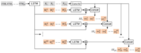 - Static embedding layer—used for the fusion and dimension conversion of the global and local task information. As shown in Figure 6, the static embedding layer consists of a one-dimensional convolution network () and LSTM networks (). is used to process the task requirements, is used to process the overall sets of all VTWs, and the left LSTMs are used to process the VTW sets from different satellites, respectively. For each task, the VTWs in its overall set of all VTWs are sorted in chronological order before being embedded. The final embedding results are denoted by a set , where is a high-dimensional embedding matrix provided to the encoding layer j. consists of embedding vectors, and is the embedding result of the task i for the encoding layer j. The generation process of is formulated as follows:where is a concatenation operator.