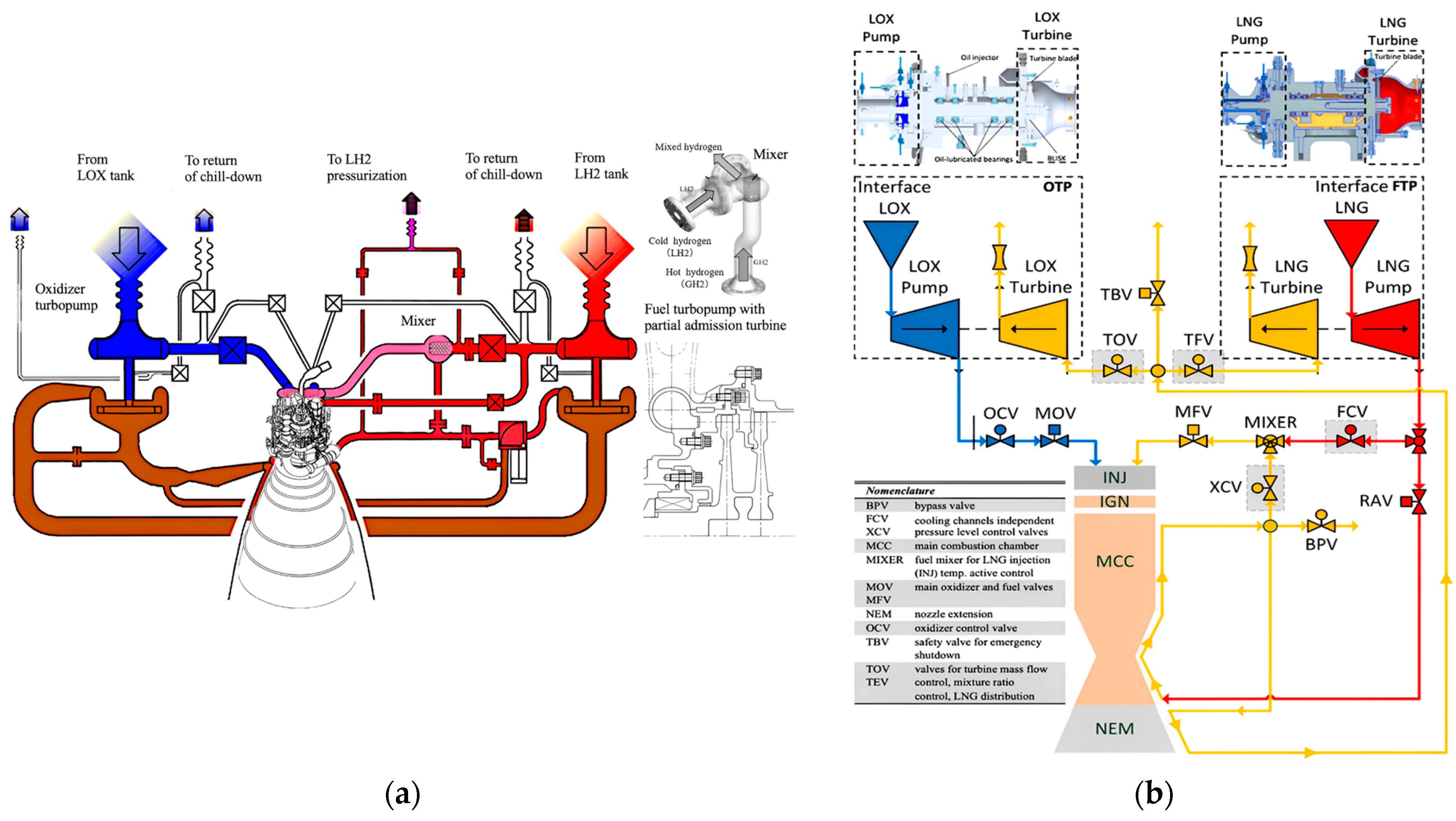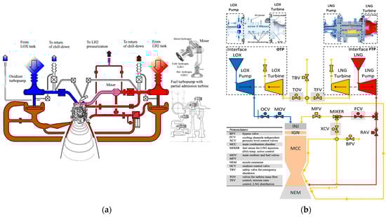 Engine schematics of (a) the LE-5B-2 engine, featuring a mixer design and a partial admission turbine blade cross-section, and (b) the LUMEN demonstrator, showing cross-sections of the LOx and LNG turbopumps (adapted from Refs. [5,6]).
