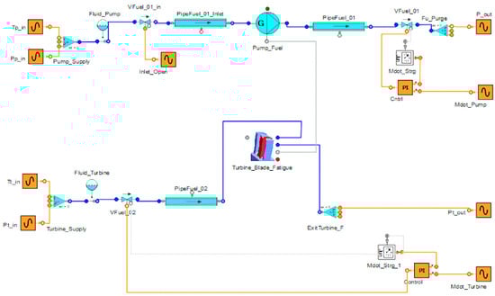 Most components of the liquid rocket engines operate under extremely harsh conditions, making transient phase operations difficult to model. Start-up and shutdown phases involve complex phenomena critical to engine design and performance evaluation, such as reverse flow in pumps, combustion instabilities, two-phase flows, and turbopumps operating outside their design parameters. To minimise the need for extensive experimental testing and enhance engine reliability, simulations of the ignition and shutdown transient periods are essential [23]. In response to these challenges, our study focused on designing a generalised turbopump model, including the Turbine Blade Fatigue module that we developed. The schematic of the generalised turbopump with a Turbine Blade Fatigue module is shown in Figure 2.