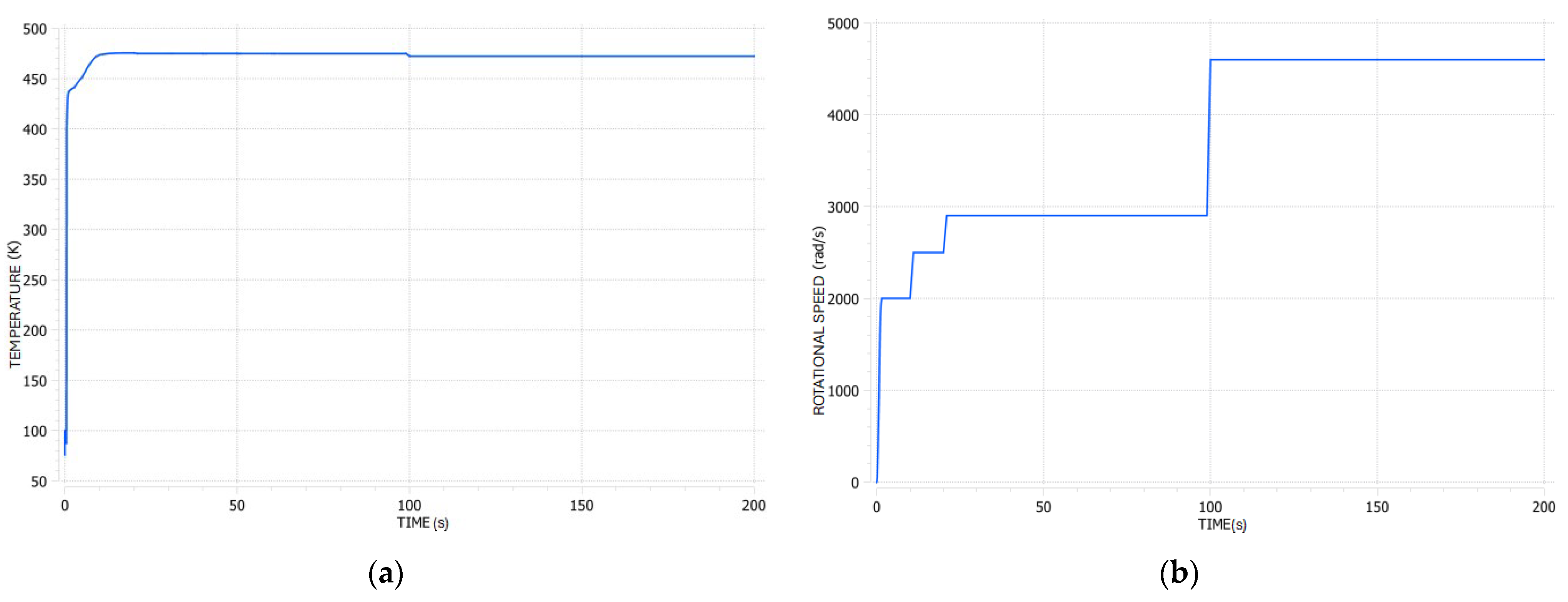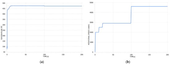 Example of the transient analysis results based on the LUMEN FTP turbopump operational envelope with (a) temperature and (b) rotational speed in rad/s.