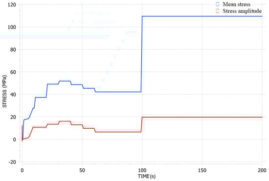 Based on the operating conditions of the LUMEN turbopump, the primary parameters of the developed generalised turbopump model, which incorporates the ‘Turbine_Blade_Fatigue’ module, were validated by referring to data from Figure 5, Figure 6 and Figure 7. The validation range includes representative conditions observed during tests at the LUMEN test bench. The mean stress and stress amplitude were estimated based on input parameters and the given operational conditions. The model enables quick predictions of expected stresses and the fatigue life of the turbopump blades. Throughout LUMEN operation, various load points were tested under different conditions over approximately 100 s, with peak loads occurring between 100 and 200 s. These conditions are reflected in the plotted design point on the Goodman–Haigh diagram.