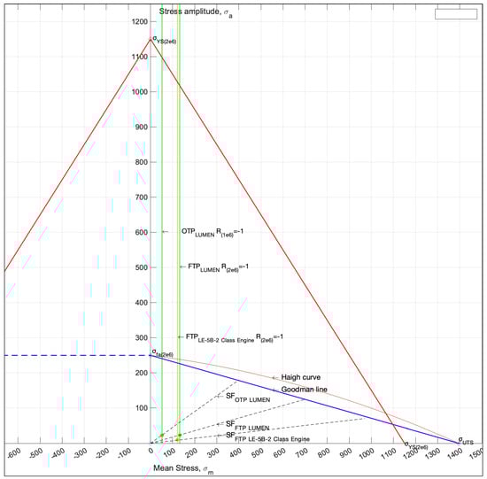 Figure 8 illustrates the Goodman–Haigh diagram showing fatigue life results for the LUMEN OTP, FTP, and the reference engine FTP at the design point stress ratio (alternating and mean stresses). As noted earlier, the S-N curve used to determine the evaluated loading conditions and the impact of mean stress on fatigue life, as depicted in the Goodman–Haigh diagram, was sourced from the literature [34].