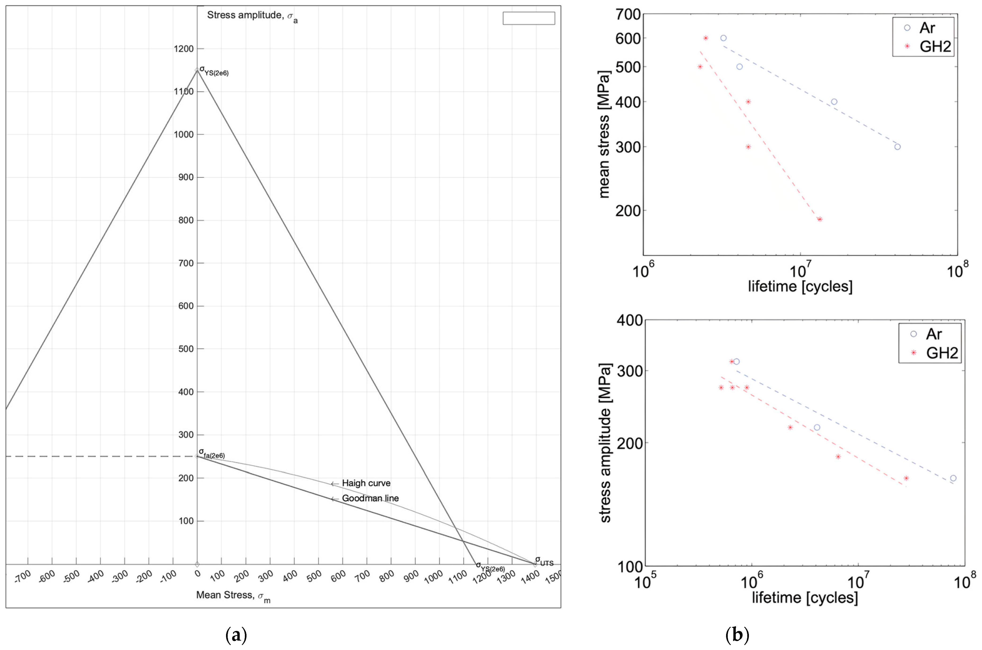 In this research, the reference engine’s turbine blade material properties were approximated from literature data. The properties of Inconel 718 in GH2 and Argon, up to the endurance limit of around 250 MPa at 2 × 106 cycles (at a mean stress of 500 MPa), were taken from Ref. [34], including values such as fatigue strength, true stress at fracture, and tensile strength. Additionally, the yield strength (YS = 1150 MPa) was derived from Refs. [38,39]. Based on this data, the Goodman–Haigh diagram (Figure 3) was developed.