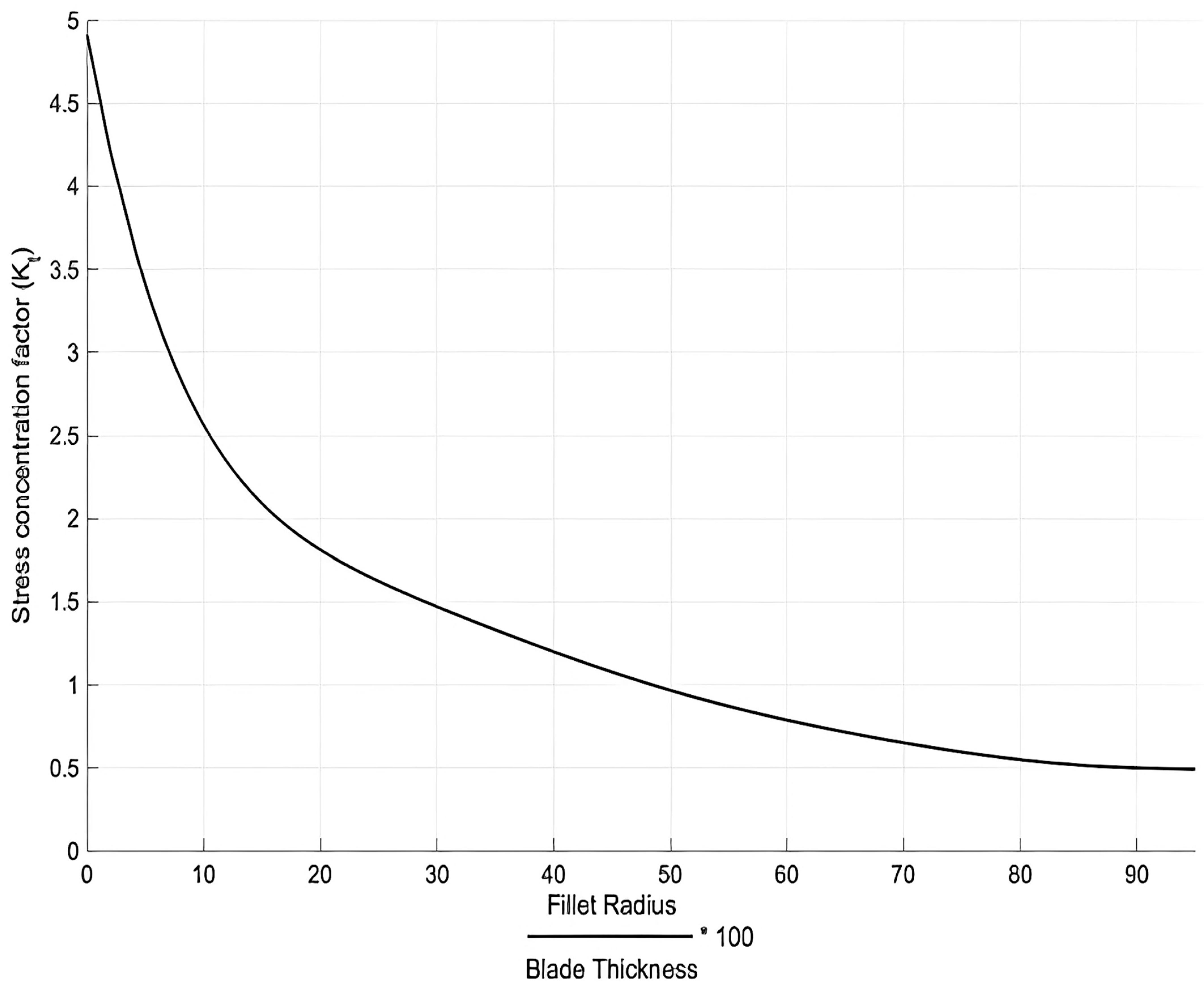 The stress concentration factor, based on the ratio of the fillet radius to blade thickness, was applied as shown in Figure 4 to account for the transition area between the blade and the disc.
