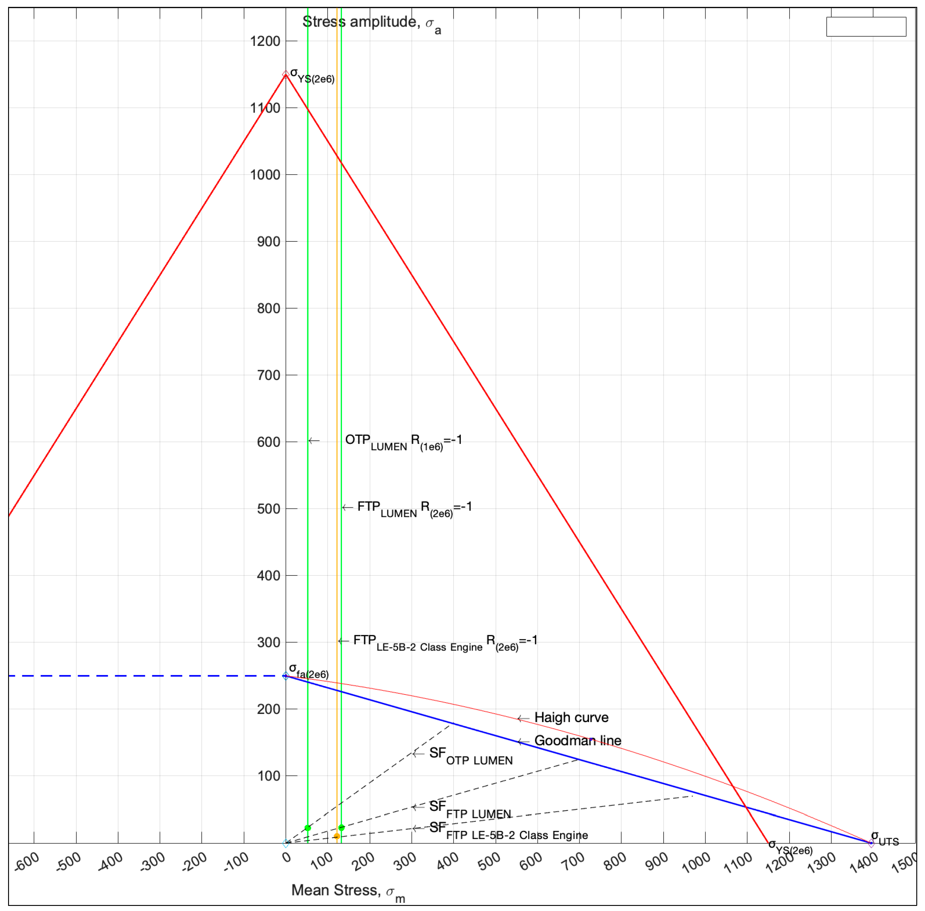 Goodman–Haigh diagram for Inconel 718 showing 2 × 106 cycles for the LUMEN FTP and OTP, along with the LE-5B-2 class engine FTP, at the specified design condition point.