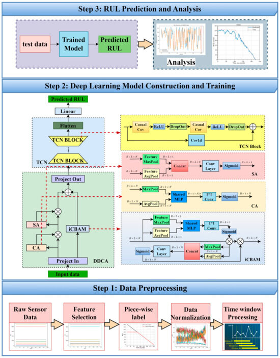 This section mainly introduces the methodology of the RUL prediction algorithm proposed in this paper. Since this study is mainly aimed at the method of RUL prediction of aeroengines, we will first introduce the overall framework of our RUL prediction process in this paper. Then, for the proposed DDCA-TCN neural network model, the main modules contained in the network are introduced one by one, including their principles and characteristics.