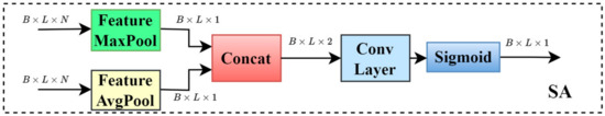 be the input of the spatial attention module, where B, L, and N represent the batch size, sequence length, and number of features, respectively. The input feature map is aggregated along the feature dimension using max pooling