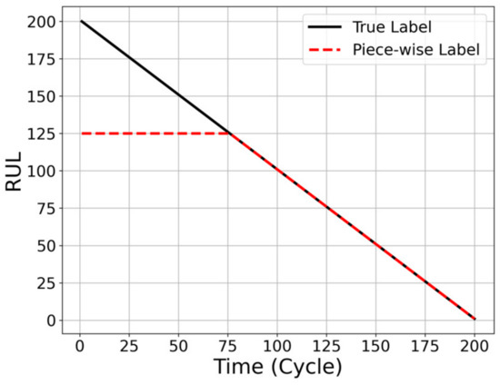 33]. This model effectively divides the RUL of the aeroengine into two distinct periods: During the first period, when the engine operates in good condition, the RUL keeps a constant value. Then, the engine enters the second period when the engine starts to degrade and the RUL decreases linearly.
