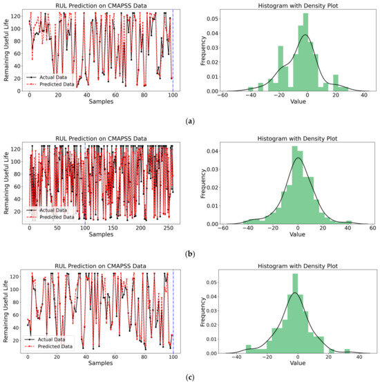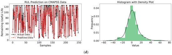 Figure 8 shows the RUL prediction values of the model on all four subsets, while the right side displays the corresponding probability distribution histogram and probability density function of the prediction error. The probability distribution histogram and probability density function represent the distribution of the error values between the model’s predictions and the actual values, with values closer to zero indicating more accurate predictions. According to the definition of the SCORE metric, predicting RUL earlier rather than later results in a better score. It can be seen that all RUL-predicted values are very close to the true values, and the prediction errors are mainly concentrated around the 0 value. This clearly indicates that the DDCA-TCN network has excellent predictive performance and generalization ability.