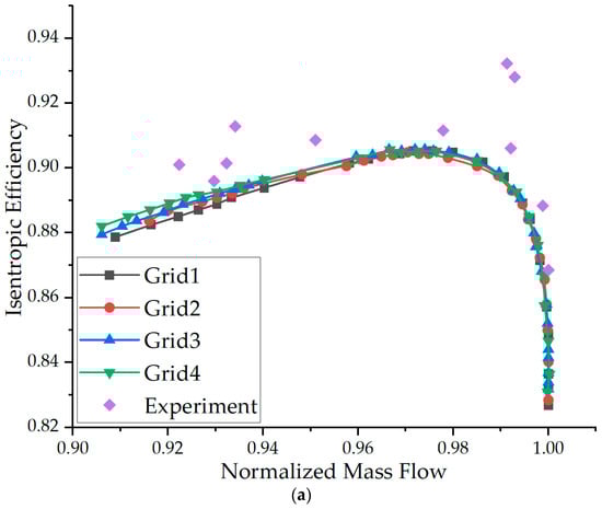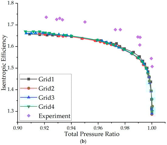 Comparison of characteristic curves calculated from four sets of grids with experiments: (a) isentropic efficiency; (b) total pressure ratio.