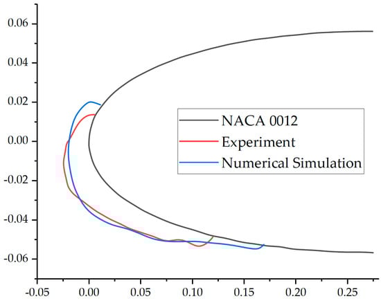 Figure 4 is a comparison chart of the numerical simulation results and the experimental results. The horizontal and vertical coordinates in the figure are the dimensionless numbers of the wing coordinate and the chord length. It can be observed that the icing obtained by the numerical simulation is basically consistent with the icing obtained by the experiment in terms of ice shape and size, which proves that the selected numerical model is reliable.
