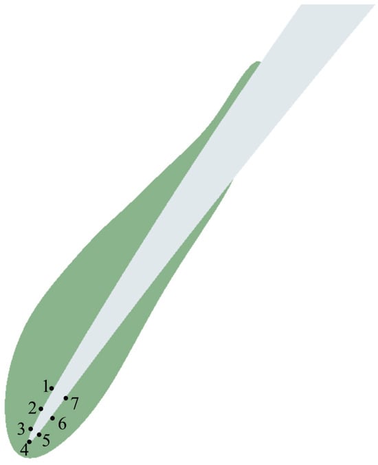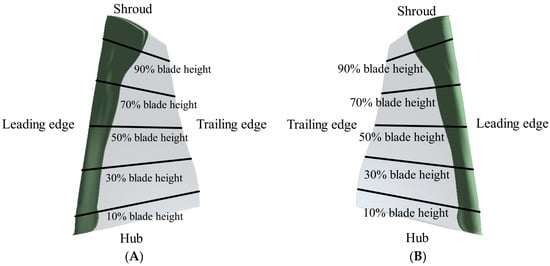To further quantify the high-stress regions in a single blade height plane, 21 evenly distributed points were selected along the contact surface, from a position at 5% chord length from the leading edge on the suction side to a position at 5% chord length from the leading edge on the pressure side, as shown in Figure 8.