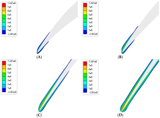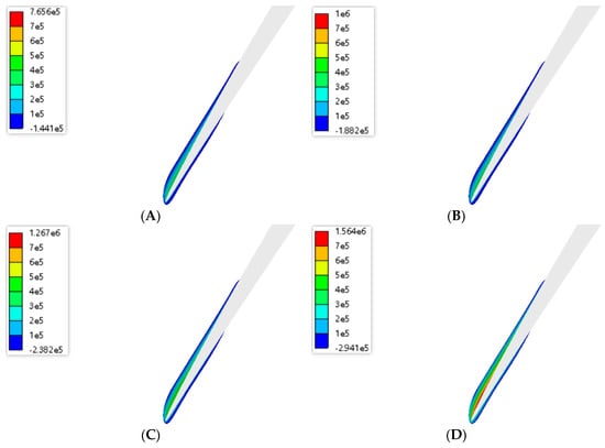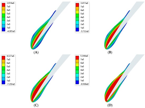 Maximum principal stress distribution at 50% blade height for 30 s icing time at various speeds (Pa): (A) 70% design rotational speed; (B) 80% design rotational speed; (C) 90% design rotational speed; and (D) 100% design rotational speed.