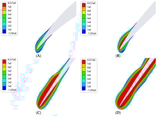 Maximum principal stress distribution at 50% blade height for 15 s icing time at various speeds (Pa): (A) 70% design rotational speed; (B) 80% design rotational speed; (C) 90% design rotational speed; and (D) 100% design rotational speed.