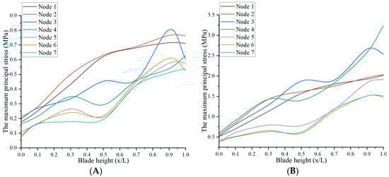 Variation trend of maximum principal stress along blade height at various nodes under 90% rotational speed: (A) 15-s icing; (B) 30-s icing.
