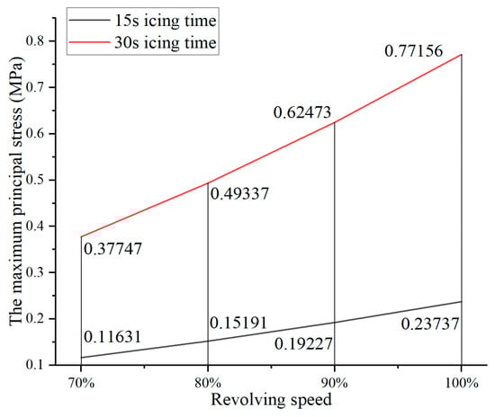 The maximum principal stresses of the ice shapes at various rotational speeds were numerically averaged to obtain the data shown in Figure 14. The results clearly indicate that the average maximum principal stress within the ice layer on the blade increases with the rotor speed. This trend highlights the critical impact of the operational speed on the structural integrity of the ice accumulation, suggesting that higher rotational speeds exacerbate the internal stress levels within the ice layer.