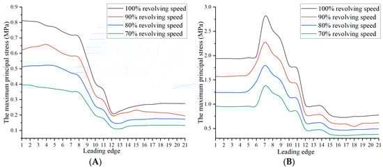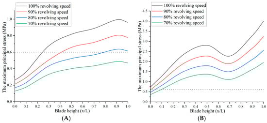 The magnitude of the maximum principal stress at different blade heights for various rotational speeds: (A) 15-s icing; (B) 30-s icing.