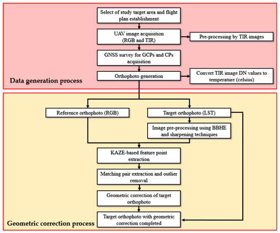 Figure 10 shows the research flow chart for the geometric correction of orthophotos generated from RGB images and TIR sensor data. First, preprocessing was necessary for the TIR orthophotos because the small differences in pixel values between neighboring pixels made it difficult to extract features for accurate alignment. To address this issue, brightness-preserving BBHE and sharpening methods were applied to enhance feature extraction. The extracted features were then applied back to the original LST orthophotos before performing geometric correction, ensuring that the temperature values were not affected.