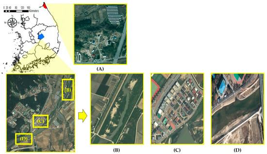 Four research sites were selected for investigation in this work. Study area A is located in Yongchon-ri, Toseong-myeon, Goseong-gun, Gangwon-do in South Korea (latitude: 38.234; longitude: 128.570). In 2019, a forest fire in Gangwon-do damaged the mountain area and some parts of a village. Many restorations on these damaged portions were performed in 2023. Study site A currently has various land covers, including buildings, mountains, fields, and roads. Study sites B (latitude: 36.375; longitude: 128.147), C (latitude: 36.377; longitude: 128.149), and D (latitude: 36.383; longitude: 128.155) are located in Gajang-dong, Sangju-si, Gyeongsangbuk-do in South Korea. Sites B and D are small streams in the city center, with the amount of water in area D being higher than that in area B. This area was selected to study the possibility of a geometric correction of the river and surrounding areas. The land covers of these two regions differed from each other, which was why each was selected. Study area C is a residential area in front of the Sangju campus of the Kyungpook National University in South Korea. It was selected for geometric correction on areas concentrated with buildings. All the remaining study sites, except for C, are areas that have changed over time since 2019 and 2020. Therefore, only four study sites were selected to confirm the non-changing and changing areas (Figure 2).