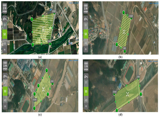 The flight planning application differed for each type of UAV and sensor; therefore, two types of flight planning applications were used in this study. The flight planning software can set the shooting environment (e.g., flight plan and height, speed, and overlap). Information, such as the capture interval, battery status, reception status, and real-time video, can be checked depending on the shooting range, speed, and overlap. Inspire 1 and 2, Pix4d Capture, and Matrice 300 RTK used DJI Pilot. Table 1 presents the UAV image acquisition dates. All images were acquired between 12:00 and 13:00 when the sun was at its highest.