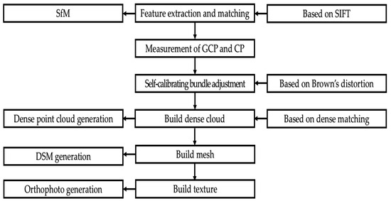 where X, Y, and Z are the point coordinates in the local camera coordinate system; u and v are the projected point coordinates in the image coordinate system (in pixels); f is the focal length; Cx and Cy are the principal point offsets; K1, K2, K3, and K4 are the radial distortion coefficients; P1 and P2 are the tangential distortion coefficients; B1 and B2 are the affinity and non-orthogonality coefficients, respectively; and w and h are the image width and height, respectively. Brown’s distortion model was used to correct the lens distortion in digital photography and multispectral cameras [28]. The feature points extracted based on the SIFT method proceeded with a high-density point construction through the structure from motion (SfM). The final orthophoto was generated after the mesh construction and texturing (Figure 6).