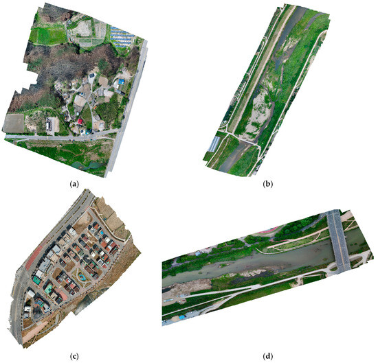 Orthophotos of the four study areas: (a) latitude: 38.234 and longitude: 128.570; (b) latitude: 36.375 and longitude: 128.147; (c) latitude: 36.377 and longitude: 128.149; and (d) latitude: 36.383 and longitude: 128.155.