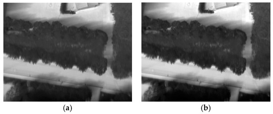 For the TIR-generated temperature orthophoto, extracting features required for geometric correction was challenging because the differences in pixel values were minimal, making preprocessing necessary. Preprocessing was performed to extract more feature points compared to the original image by compensating for the brightness value distribution, allowing for better feature point matching. However, histogram equalization (HE) had the drawback of excessively altering the average brightness value of the transformed image compared to the original. Regardless of whether the average brightness value of the original image was high or low, HE transformed it to a mid-range contrast value, which led to an overemphasis on the brightness of the converted image [32]. In contrast, the BBHE method divided the average brightness value of the original image into two sub-histograms to avoid drastically changing the image brightness. Histogram smoothing was performed independently within each sub-histogram [33,34]. Using the BBHE method, additional sharpening was applied to enhance the image boundary, resulting in the extraction of more feature points compared to when only the BBHE method was used. The unsharp masking method was employed. Unsharp masking enhances sharpness by isolating the high-frequency components of the original image and adding them back to the image [35]. When the original and high-frequency images are combined, the edges are emphasized, and an image with improved contrast is obtained. The unsharp masking method is expressed by Equation (13) [36].