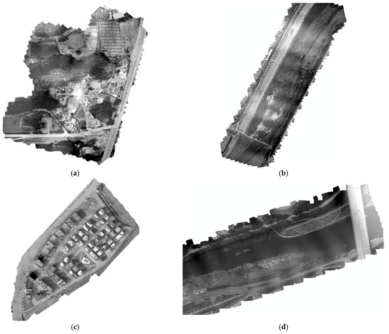 TIR orthophotos of the four study areas (by Zenmuse XT): (a) latitude: 38.234 and longitude: 128.570; (b) latitude: 36.375 and longitude: 128.147; (c) latitude: 36.377 and longitude: 128.149; and (d) latitude: 36.383 and longitude: 128.155.