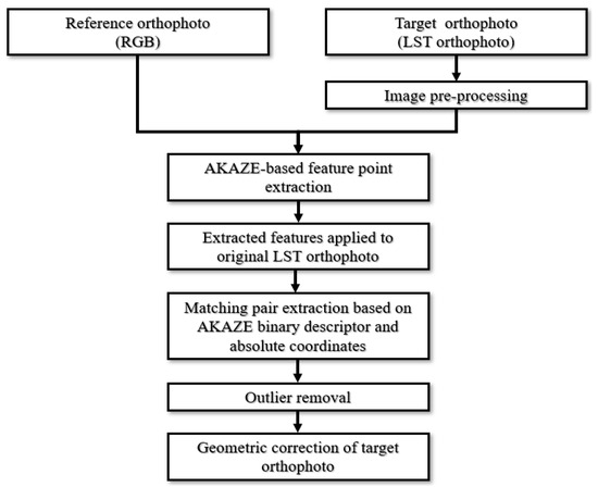 Thus, this study aims to address these challenges by exploring a novel approach that uses RGB orthophotos as reference images for the geometric correction of TIR orthophotos. The method focuses on extracting and matching feature points between the two image types using the accelerated-KAZE (AKAZE) method, integrating binary descriptors and absolute coordinate-based matching techniques to achieve high accuracy in geometric correction, even in regions with significant temporal and spatial changes.