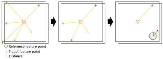 Matching pair extraction employs two methods: binary descriptor-based and coordinate-based methods. A descriptor that characterizes the feature points extracted by the AKAZE method must be created, and these characteristics are described using the generated descriptor. The AKAZE method utilizes a binary descriptor [48]. Various types of binary descriptors are also used in BRIEF, ORB, and BRISK feature point extraction methods. The M-LDB, which uses gradient and intensity information in the nonlinear scale space, was employed in the AKAZE method. The M-LDB used binary tests between area averages instead of individual pixels. In addition to the intensity value, the average values of the horizontal and vertical rates of change in the comparison area were also used, enabling the use of 3-bit information in the area comparison. The similarity of matched pairs was determined using the Hamming distance [49]. For feature points extracted by the AKAZE method, matching pairs were first extracted using binary descriptors. However, when matching pairs were extracted using only binary descriptors, they were not evenly distributed across the entire orthophoto. Therefore, matching pair extraction was necessary for feature points that were not matched using binary descriptors alone. The matching was performed by calculating the distance based on the coordinate difference between the reference and target orthophotos. The distance between neighboring feature points in the target orthophoto was calculated based on one feature point in the reference orthophoto. Candidates were selected such that the distance matched the feature point in the target orthophoto that fell within the threshold value. During the extraction of a candidate group of matching pairs, if one feature point matched multiple feature points in the target orthophoto, only one matching pair was allowed, considering directionality (Figure 11). The NGII aerial photogrammetry work regulations and the digital aerial photogrammetry adjustment calculations and margins of error were used to determine the threshold value. A matching pair extracted based on the final coordinates was fused with the previously obtained binary descriptor to determine the final matching pair.