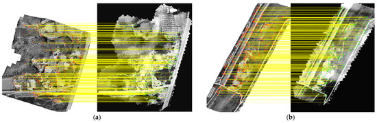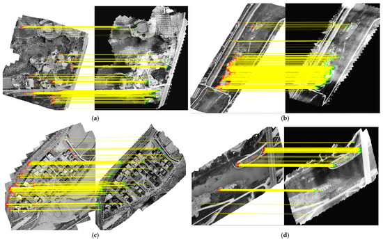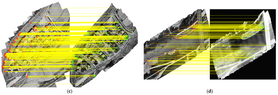 Result of the TIR mismatching pair removal in the four study areas (by the binary descriptor): (a) left: 3 September 2019 and right: 3 September 2019; (b) left: 23 June 2019 and right: 15 December 2019; (c) left: 28 April 2020 and right: 17 May 2020; and (d) left: 1 July 2019 and right: 9 July 2019. The red points represent the feature points of the reference image, the green points represent the feature points of the target image, and the yellow lines indicate the matching pairs.