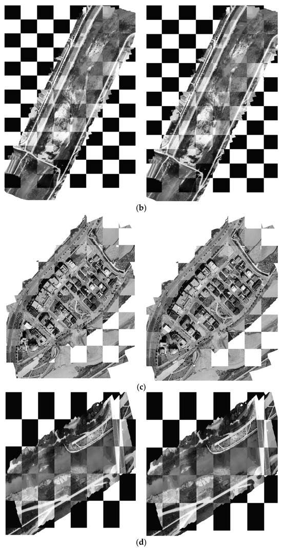 The outlier removal results using RANSAC showed that when only binary descriptors were used, study site A had 380 matches, B had 440, C had 386, and D had 171. Using the proposed technique, study site A had 454 matches, B had 486, C had 492, and D had 221 (Table 7). When matching pairs were extracted using the proposed technique, both the number of matching pairs and their distribution across the image increased. Figure 14 illustrates the geometric correction results with the matching pairs extracted using the proposed technique and an overlapping mosaic image, created by dividing the reference and target images into a grid format.