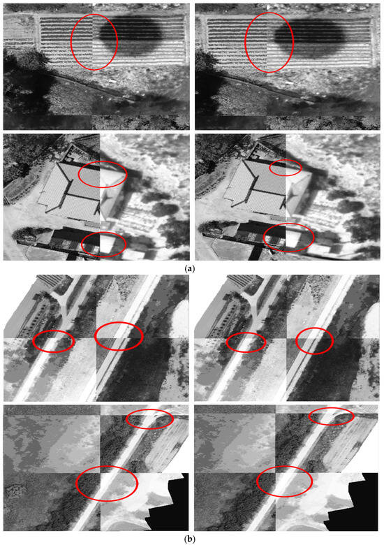 Result of the mosaic image after performing the geometric correction for the TIR (left: original orthophotos; right: geometry correction orthophotos): (a) left: 3 September 2019 and right: 3 September 2019; (b) left: 23 June 2019 and right: 15 December 2019; (c) left: 28 April 2020 and right: 17 May 2020; and (d) left: 1 July 2019 and right: 9 July 2019.