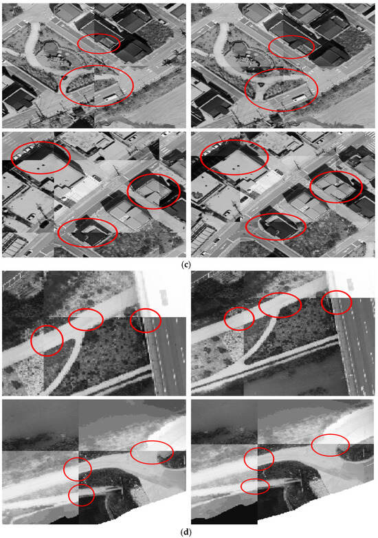 Visual inspection of TIR orthophoto mosaic images before and after geometric correction for each study area (enlarged image before correction on the left, enlarged image after correction on the right).: (a) left: 3 September 2019 and right: 3 September 2019; (b) left: 23 June 2019 and right: 15 December 2019; (c) left: 28 April 2020 and right: 17 May 2020; and (d) left: 1 July 2019 and right: 9 July 2019.
