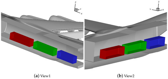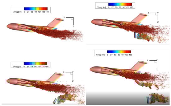 The problem being considered is shown in Figure 1. Snapshots of the payload being released from the C-17 aircraft at various time intervals are also shown in Figure 2. The C-17 configuration used in study is similar to the one used in Refs. [2,4]. This geometry is shown in Figure 3. The C-17 aircraft model, used here, has four F117-PW-100 Turbofan engines (Pratt & Whitney, East Hartford, CT, USA), an open cargo door, and flaps extended. This geometry includes the asymmetric fuselage resulting from the addition of the auxiliary power unit on the starboard side of the aircraft. C-17 models have deck (pitch) angles of 0, 5, and 7 degrees. C-17 with deck angle of 7 degrees is compared with the model with zero angle in Figure 3.