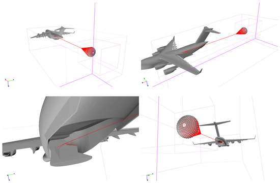 Bergeron et al. [2] investigated the near-field flow solutions of the C-17 aircraft with both open and closed cargo ramps. The simulations incorporated engine inlet and exhaust flows, extended flaps, and an asymmetric fuselage due to the installation of the auxiliary power unit on the starboard side of the aircraft. A rigid model of a ring-slot chute with a projected diameter of 24.45 feet () was placed behind the C-17 cargo door. However, it is important to note that the chute–C-17 simulations were conducted primarily for demonstration purposes, as the chute’s position relative to the C-17 did not accurately reflect the actual lengths of the extraction and suspension lines. Bergeron et al. [2] demonstrated that the flow field impacting the chute comprises two primary components: an accelerated flow emanating from beneath the fuselage and an unsteady wake flow.
