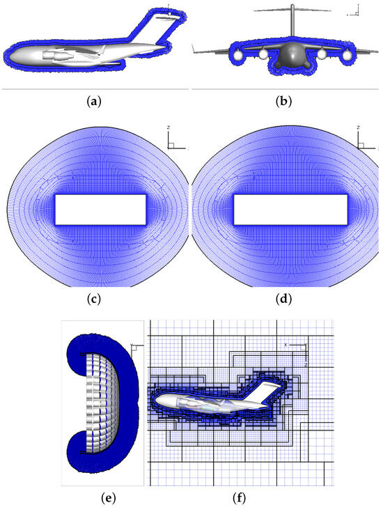 - Bergeron, K.; Ghoreyshi, M.; Larsen, E.; Jirasek, A.; Rose, T.M.; Noetscher, G. Near-Body/Cartesian Off-Body Simulations for C-17 and Extraction Parachute. In Proceedings of the AIAA AVIATION 2020 FORUM, Virtual, 15–19 June 2020. [Google Scholar] [CrossRef]