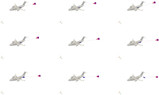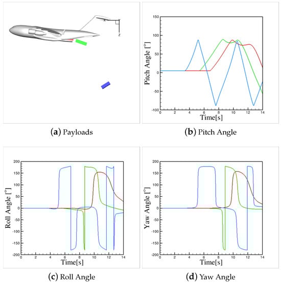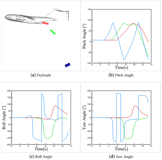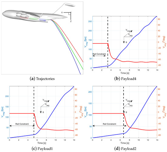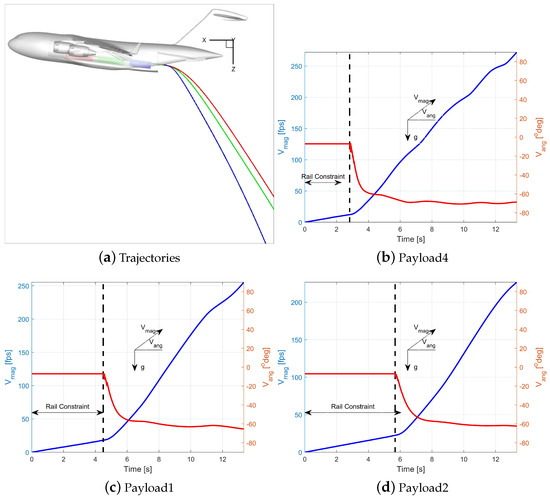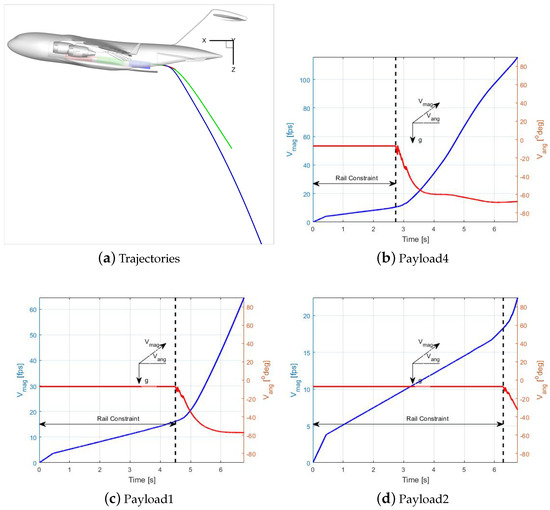 Figure 9b–d show the velocity magnitudes and angles for each payload. All of these plots feature dual Y-axes: the left Y-axis, in blue, represents the velocity magnitude, while the right Y-axis, in red, shows the velocity angle. Please note that the plot colors correspond to their respective Y-axis definitions. Note that all payloads undergo a nearly constant acceleration (velocity slopes) when there are inside the cargo bay. This acceleration corresponds to , especially for Payloads 1 and 2. After leaving the cargo bay and completing the rail constraints, payloads will experience gravitational and aerodynamic forces and therefore the velocity slopes change. Note that the acceleration rate after the rail constraint is not 32.17 , but smaller, because of the drag forces. The velocity angle indicates the angle between velocity and horizontal line and is positive when the velocity vector is above the horizon. In this definition, a free-fall has − angle. Figure 9b–d show that all payloads have a constant velocity angle of about − while they are moving inside the C-17 cargo bay. The velocity angle suddenly drops after the ramp and eventually reach angles about −.