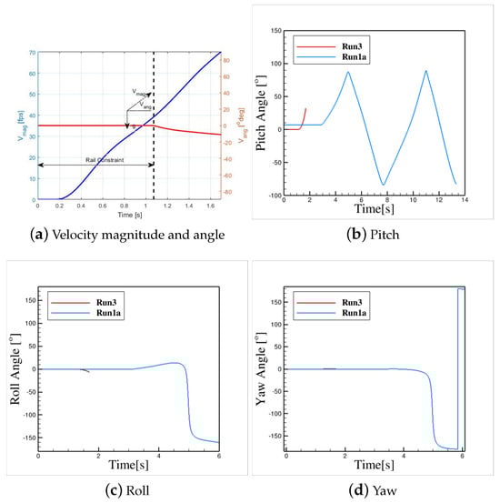 In addition, Figure 10 shows the payload rotations during Run1a. Again, trends follow what observed during flight tests. These payloads are expected to show a clock-wise pitch rotation after leaving C-17 aircraft. Positive pitch rates in the predicted plots show clock-wise rotations as well. Note that Kestrel reported pitch angle is in the range of [−–], and a drop in the pitch rate at means a continues pitch rotation. Additionally, a higher exit velocity leads to a smaller rotation rate. Figure 10 shows that Payload2 has the smallest rate and Payload4 has highest pitch rotation rates. Payload4 shows a continues negative roll to −, at which the roll sign changes to for further roll rotations. Payload2 shows a positive roll and Payload1 shows a negative roll as well.