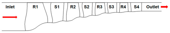 Taking a four-stage transonic axial flow compressor as the research object, the meridian view is shown in Figure 1. The equal-diameter design is adopted with a wavy hub, and the flow channel gradually shrinks.