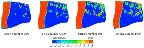 The number of particles tracked is a very important parameter when using the Lagrange particle tracking method to track raindrops. Figure 5 shows the diameter distribution of raindrop particles on the pressure surface of the first-stage rotor blade when the diameter of the raindrop is 1 mm and the rainfall absorption is 5%. It can be seen from the figure that when the number of raindrop particles is 5000, the diameter distribution of raindrop particles on the pressure surface of the first-stage rotor tends to be stable, so the final number of raindrop particles is determined to be 5000.