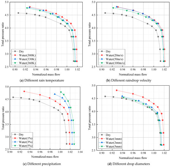 As shown in Figure 6d, the smaller the initial diameter of the raindrop, the higher the total pressure ratio of the compressor, the smaller the flow near the stall point, the larger the flow near the blocking point, and the larger the stable working range. Compared with the dry compression condition, the stable working range of the compressor decreases by 15%, 29% and 32.2%, respectively, for raindrops with an initial diameter of 1 mm, 3 mm and 5 mm. The influence of the diameter change on the stable working range is also great. When the inlet flow rate of the compressor is the design flow rate, compared with the dry compression condition, the total pressure ratio of the compressor increases by 7.5%, 2.2% and 0.6% with the initial diameter of 1 mm, 3 mm and 5 mm, respectively, which indicates that when the initial diameter of the raindrop is too large, the effect of rain absorption on the pressure ratio of the compressor is not obvious. This is similar to the conclusion of Roumeliotis [18].