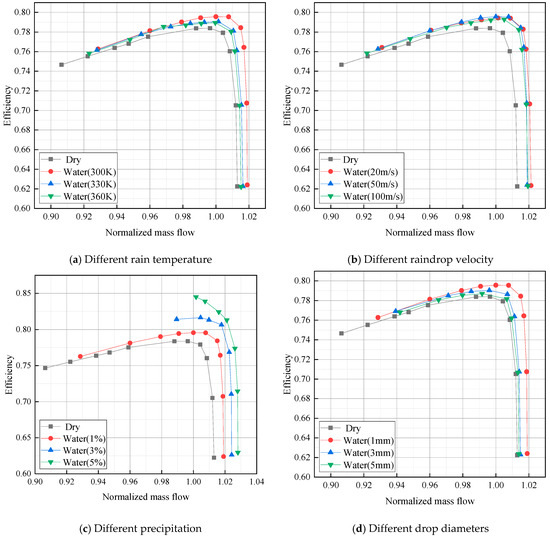 Figure 7 shows the efficiency–flow curve. As a whole, rain absorption can increase compressor efficiency, but the increase in efficiency near the stall point is smaller than that near the design flow point. As shown in Figure 7a, the lower the initial temperature of the raindrop, the higher the compressor efficiency. When the inlet flow rate of the compressor is the design flow rate, compared with the dry compression condition, the raindrop with the initial temperature of 300 K, 330 K and 360 K increases the compressor efficiency by 1.38%, 0.72% and 0.85%. The initial temperature change in raindrops does not affect the increase range of compressor efficiency. When the design flow point is near, the impact range of the initial temperature 330 K and 360 K raindrop on the compressor efficiency is small, and the difference is not large, and the impact of the initial temperature 300 K raindrop on the compressor efficiency is more obvious. As shown in Figure 7b, the change in the initial velocity of the raindrop has little effect on the increase in the compressor efficiency. Only when the design flow point is near, the efficiency of the raindrop with the initial velocity of 100 m/s will be significantly less than that of other initial velocity raindrops. When the flow point is designed, the initial velocity of 20 m/s, 50 m/s and 100 m/s raindrops increases the compressor efficiency by 1.24%, 1.38% and 1.07%, respectively, compared to the dry compression condition. As shown in Figure 7c, the influence of the suction rainfall of the compressor on the efficiency is very significant compared with other conditions.