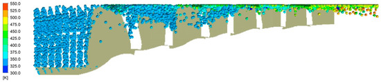 Figure 9 shows the temperature change in raindrop particles during their flow. There are two ways to change the temperature of raindrop particles: one is the convective heat transfer between the air, and the other is the latent heat of vaporization during the evaporation reaction, both of which will increase the temperature of the raindrop particles. As can be seen from the figure, the temperature of the raindrop particles does not change much in the front stage, because in the front stage, the temperature of the air is not very high, the temperature difference between the raindrop particles is small, the heat transfer by convection is relatively small, the evaporation reaction is not severe in the front stage, and the latent heat of vaporization is relatively small. At the latter stage, the raindrop absorbs enough heat, and the temperature rises enough for the evaporation reaction to occur. In addition, due to the radial pressure gradient, the pressure at the tip of the leaf is higher, resulting in a higher saturation temperature of the droplet during evaporation, so the temperature of the raindrop at the tip of the leaf is higher.