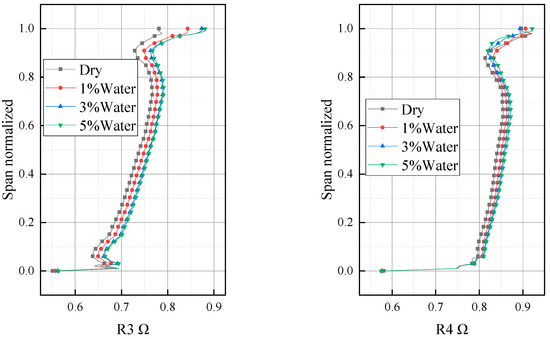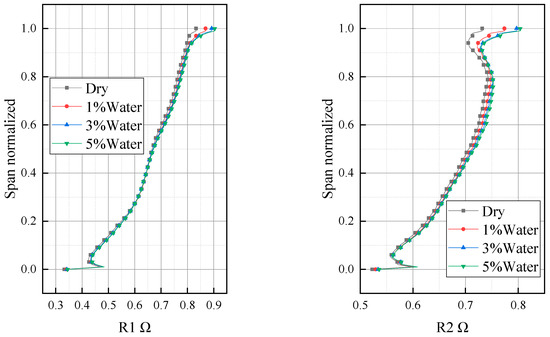 The static pressure of the airflow will be increased when the airflow flows through the moving blade and the static blade. In order to measure the proportion of the increase in the pressure of the airflow in the moving blade and the static blade, the concept of inverse force is introduced. The inverse force is the ratio of the energy used for the pressure potential energy conversion in the moving blade to the pressure potential energy conversion in the whole stage. Figure 10 shows the distribution of reaction force along blade height. It can be seen from the figure that the inverse force in the direction of blade height presents a trend of higher blade tip and lower blade root, which indicates that the diffusing capacity of the tip region of the moving blade is stronger than that of the blade root. Rain absorption increases the reaction force on the whole, which indicates that rain absorption increases the load of the moving blade. This is consistent with Wang’s conclusion [25]. With the increase in rainfall absorption, the reverse force also increases, but the reverse force changes little when the rainfall absorption is 3% and 5%. Although raindrops converge in the overall upward casing region, the influence of rain absorption on the reaction force gradually extends from the blade root to the entire channel due to the gradual contraction of the flow channel shape of the compressor model.