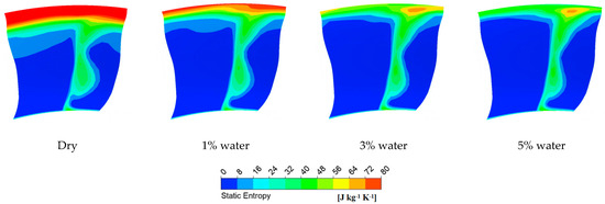 Figure 13 and Figure 14 show the static entropy distribution of the first stage rotor outlet and 99% blade height of the first stage rotor. It can be seen from the figure that rain absorption reduces the entropy in at the shock wave, reduces the compressor loss, and reduces the entropy increase at the tip of the blade. With the increase in rain absorption, the greater the decrease in entropy increase, the lower the compressor loss.